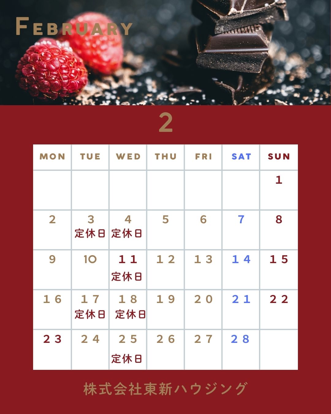 2月の営業日カレンダーのお知らせです📅